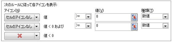 「数値」「0以上」なら「アイコンなし」の条件を2つ作成し、3つ目(それ以外、つまり負の数)で任意のアイコンを指定する