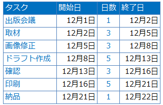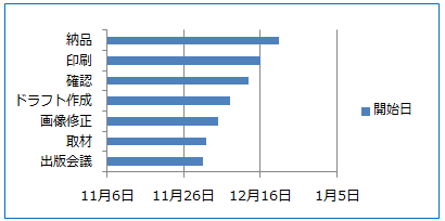まず積み上げ横棒グラフを作成します。積み上げ横棒はY軸が項目、X軸が数値軸です。X軸を日付とし、開始日と工数(日数)を積み上げて表示します。例えばX軸が12/1〜表示していて、【開始日】が12/3なら値は3なのでメモリ3までの横棒です。【日付】はその上に積み上げられるので12/3から3日間なら、合計6の値になります。