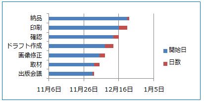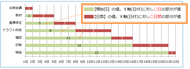 開始日と日数の積み上げ横棒グラフが作成された▼▼(開始日と日数の値が積み上げ)
