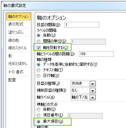 「軸を反転する」にチェックを入れ、「横軸との交点」を「最大項目」にし「閉じる」をクリック