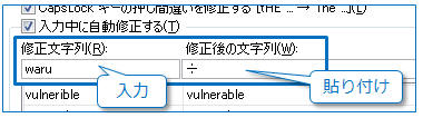 「修正文字列」ボックスに入力文字を入力(ここではwaru)
