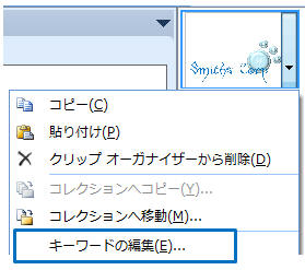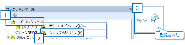 クリップオーガナイザのマイコレクションで右クリックし「クリップの貼り付け」をクリック