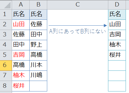 ★MATCH(A列,B列,0) … A列を検索値としてB列範囲を探し、なければ#N/Aエラーが帰ります。
