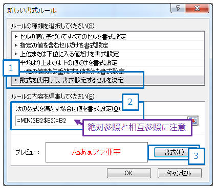 ★=MIN(1行目)=最初のセル(1行目は行を相互参照、最初のセルは行列ともに相互参照)