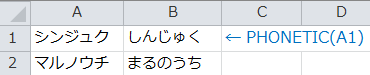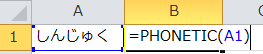 =PHONTIC(A1)と入力しオートフィル