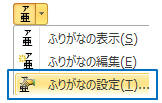 「ホーム」タブ−「ふりがなの表示/非表示」ボタンの▼から「ふりがなの設定」をクリック