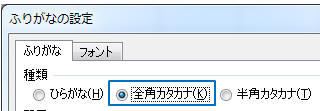 ★PHONETIC関数でカタカナにならない場合は、入力セル(A列)を選択し「ホーム」タブ−「ふりがなの表示/非表示」ボタンの▼から「ふりがなの設定」をクリックして「全角カタカナ」をクリックします。 → →
