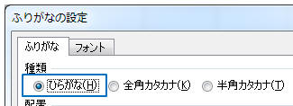 「ひらがな」をクリックし「OK」をクリック