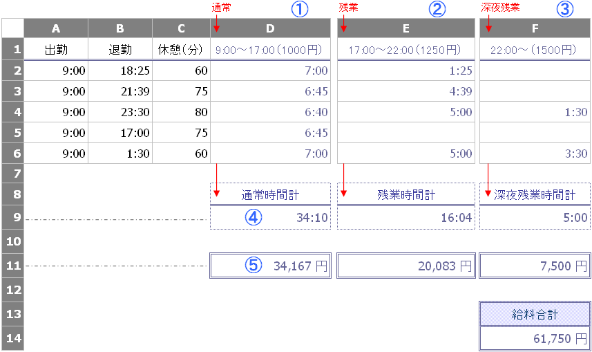 「出勤時刻」「退社時刻」「休憩時間」のみ入力すれば上記の勤務時間と給料が返るようにしましょう。