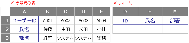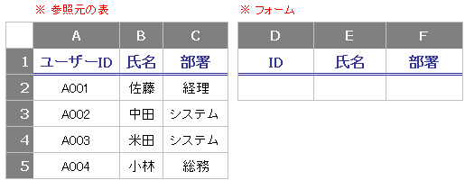 セルD2にIDを入力したら、それを条件として、E2の氏名、F2の部署に自動入力されるようにします。