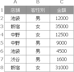 SUMIFS(C2:C8,A2:A8,"池袋",B2:B8,"男")