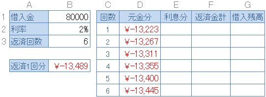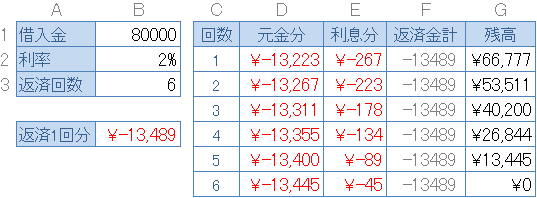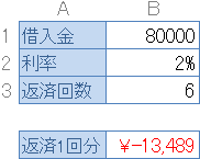 8万を2%の利率で借り、全6回で返す場合1回の返済額は以下の式で求められます。