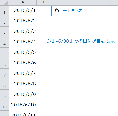 A1に =DATE(YEAR(TODAY()),C1,1) → 2016/6/1が表示 A2 =IF(A1<EOMONTH($A$1,0),A1+1,"") と入力し、31行以上適当にオートフィル★1 ★1 前のセルが月末よりも小さいなら(6/30以前なら)前のセル日付+1、そうでないなら空白