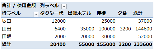 ◆ 例1:各社員がどんな目的でいくら使っているかを簡単に集計