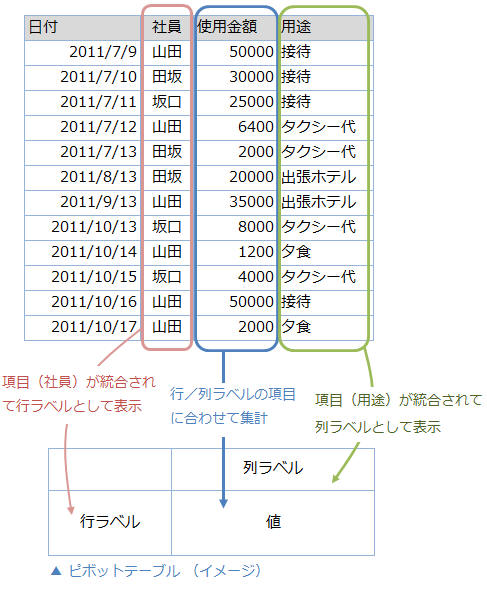 このように簡単に欲しい情報を取り出すことができます。ピボットテーブルでは、元データの項目名(フィールド)をピボットテーブルの任意のエリアに配置することで統合や集計が行われます。イメージを確認してみましょう。