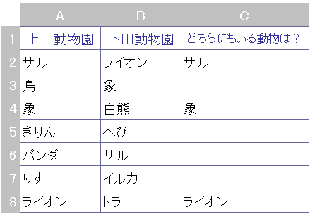C2に以下の式を入力しオートフィルします。 = IF(COUNTIF($B$2:$B$8,A2),A2,"") この式では、「A2セルの値がB列のデータ範囲の中にあるなら、A2の値を取り出す」という式になります。 ★補足★ 2つ以上の場合の条件式は… = IF(COUNTIF(範囲,セル)>=2,セル,"")