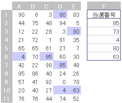 数字が入力されているセル範囲に対し、別のセル範囲と同じ番号に自動で色を設定できます。例えば当選番号と同じ