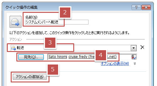 「ホーム」タブ−「クイック操作」グループにある「新規作成」をクリック クイック操作名を入力 「アクションの選択▼」か ら動作(転送・フォルダへ移動など)を選択 更に下にボックスが表示された場合 (宛先や移動先フォルダなど)は適宜入力する 次の動作を指定したい場合は「アクションの追加」から同様に設定する 全ての動作を指定できたら「完了」をクリック