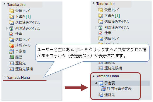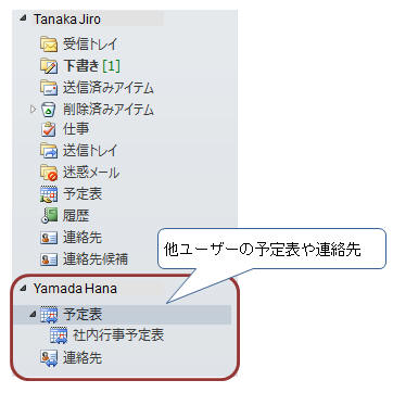 この方法では既定以外の予定表(ユーザーが作成した予定表フォルダ)も共有できるため、特定のプロジェクトの予定表や工程表などとしても利用できます。共有するとメールボックス一覧に、予定表フォルダが追加されます。 POINT ◎ メールボックス内のどのフォルダでも共有が可能。(既定の予定表以外でも共有できる) ◎ 常に自分のメールボックスと同じようにフォルダが表示される為、アクセスが簡単である。