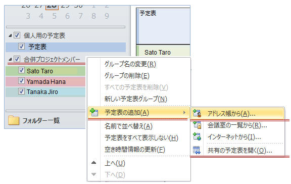 ナビゲーションウィンドウ上で予定表グループ名を右クリックし「予定表の追加」−「共有の予定表を開く」をクリック(又は「アドレス帳から」をクリック)