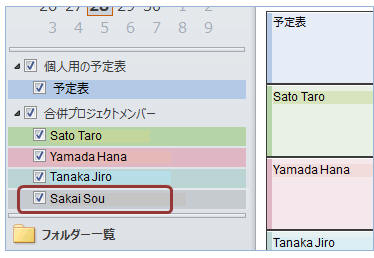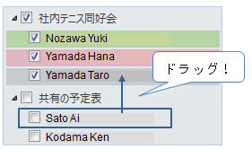 ▼ 予定表グループに新しいメンバーが追加されます ※既存の共有予定表をドラッグして追加することもできます。(Ctrlキーを押しながらドラッグするとコピー) ↑ 追加したい予定表を予定表グループ内にドラッグ