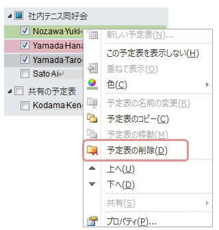 ナビゲーションウィンドウにあるメンバー(予定表)を右クリックし、「予定表の削除」をクリック