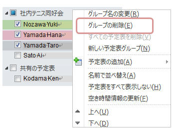ナビゲーションウィンドウにある予定表グループ名で右クリックし、「グループの削除」をクリック