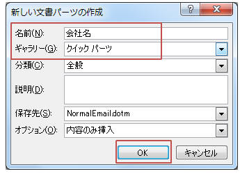 パーツ名(名前)を入力し、ギャラリーを「クリックパーツ」として「OK」をクリック