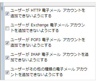 特定のアカウントの追加のみ禁止することもできます。(例えばExchangeアカウントは許可し、POPやIMAPなどは禁止など)