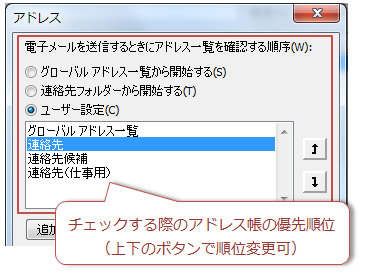★1:アドレス帳が複数ある場合(連絡先やグローバルアドレス帳など)優先順位の高いアドレス帳から探します。なければ次のアドレス帳から探します。複数のアドレス帳をまたいで候補を表示することはできないため、同一アドレス帳内の候補一覧のみ表示します。アドレス帳の優先順位は「ホーム」タブ−「アドレス帳」−「ツール」−「オプション」に表示される「アドレス」ダイアログの「電子メールを送信するときにアドレス一覧を確認する順序」で指定できます。