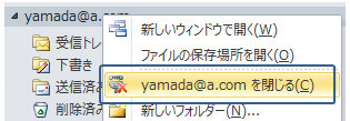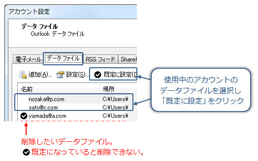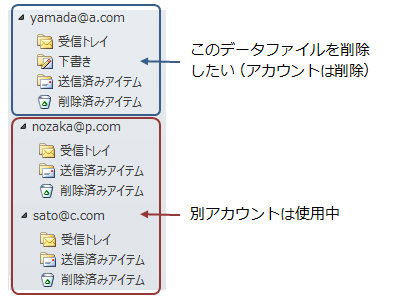 実際はアカウントではなくデータファイルが見えているだけです。Outlook2010ではアカウントを削除してもデータファイルは接続されたままなので、状況に応じて解除しましょう。