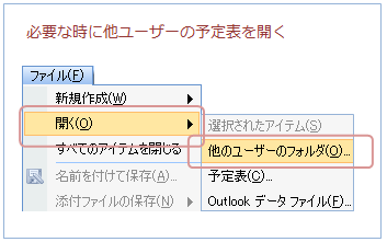 ※ Outlook2010をお使いの方は、2010:ユーザー間で予定表を共有する(完全ガイド)を参照してください。