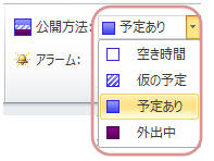 予定表アイテムを開き、「予定の公開方法」を「仮の予定」「予定あり」「外出中」のいづれかに設定する