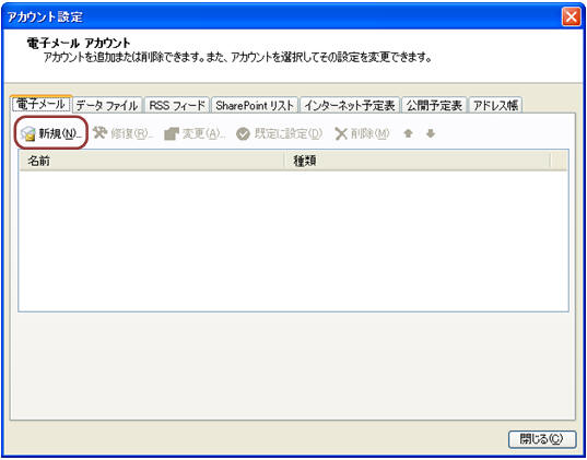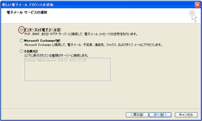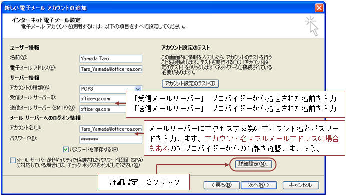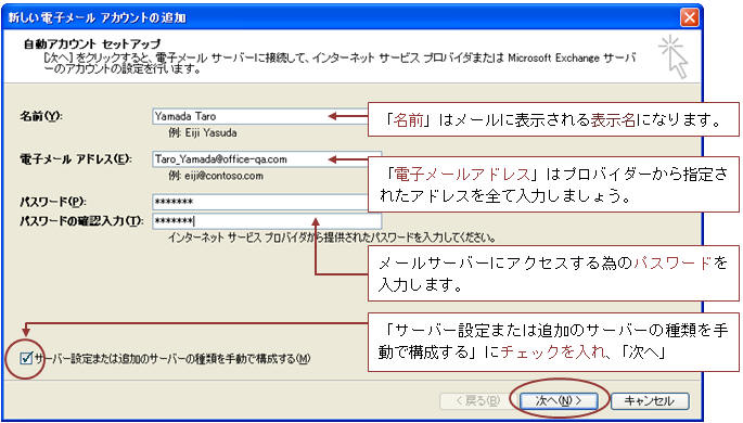 「新しい電子メールアカウントの追加」ダイアログで以下のように入力します。