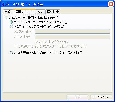 「送信サーバー」タブで「送信サーバー(SMTP)は認証が必要」にチェックが必要な場合もあります。