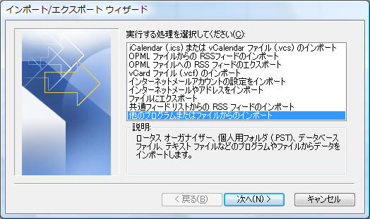 「他のプログラムまたはファイルからのインポート」を選択して「次へ」をクリック