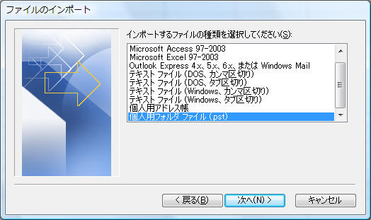 インポートするファイルの種類として「個人用フォルダファイル(pst)」を選択し「次へ」をクリック