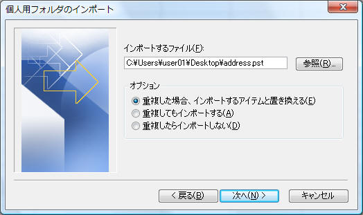 エクスポートされた連絡先が保存されているpstファイルを指定し「次へ」をクリック