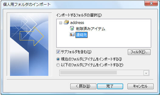 インポートするフォルダ(連絡先)を選択し、インポート先のフォルダや場所を指定して※「完了」をクリック