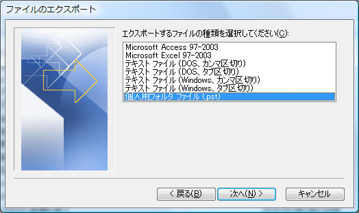 エクスポートするファイルの種類として“個人用フォルダファイル(pst)」を選択し「次へ」をクリック