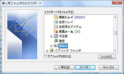 エクスポートするフォルダに“連絡先”を選択して「次へ」をクリック