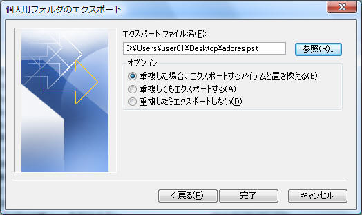 エクスポート場所とエクスポートファイル名を指定して「完了」をクリック