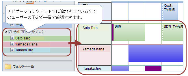 ▼ 例1:共有予定表(グループスケジュール )ではメンバーのスケジュールが一括して確認できます。 ▼ 例2:予定表フォルダを共有すると他のユーザーの予定表に簡単にアクセスでき 、既定以外の予定表フォルダも共有できます。 |