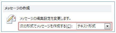 しかしこれは既定のメッセージ形式がHTML形式/リッチテキスト形式の場合のみ有効であり、メッセージ単位で形式をHTML形式/リッチテキスト形式に変更した場合は適用されません。既定のメッセージ形式とは、「ファイル」タブ−「オプション」−「メール」にある「次の形式でメッセージを作成する」で指定されている形式のことです。