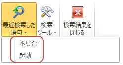 Outlook2010で検索した履歴は、「検索」タブの「最近検索した語句▼」に表示されます。