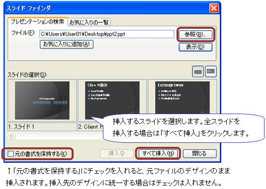 挿入したいスライドを選択して「挿入」をクリック(全スライドを挿入する場合は「すべて挿入」をクリック)