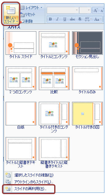 【ホーム】タブ−「新しいスライド▼」をクリックし、「スライドの再利用」をクリック