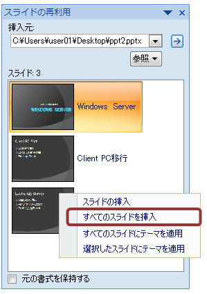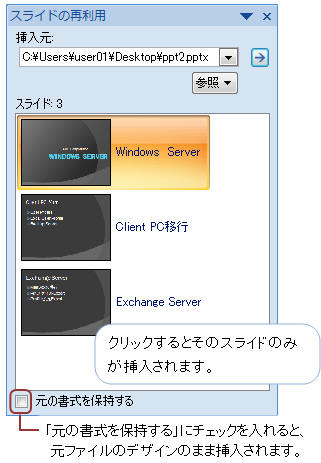 右ペインに「スライドの再利用」ウィンドウが表示されます。