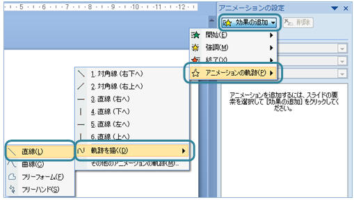 ▼」−「アニメーションの軌跡」−「軌跡を描く」−「直線」をクリック