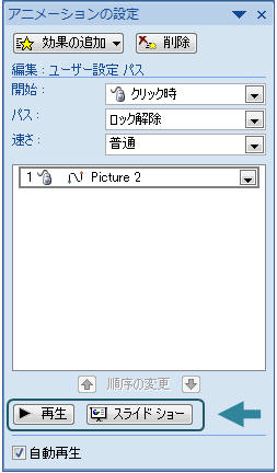 「アニメーションの設定」作業ウィンドウの「再生」又は「スライドショー」をクリックして動作を確認する